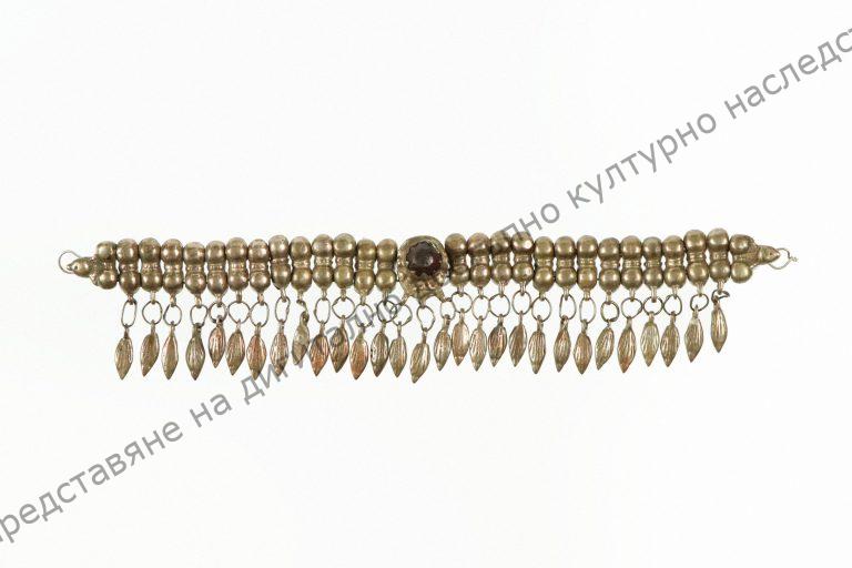 Тип „кованез“ . Наниз от плътно нанизани тела, с висулки с форма на житни зърна, в средата розетка с камък