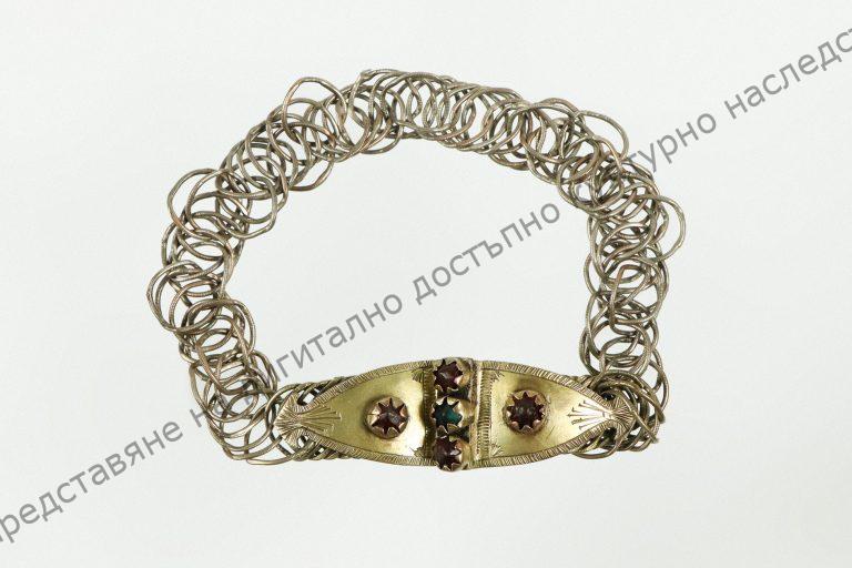 От преплетени бронзови халки. Завършват с малки триъгълни, релефно украсени бронзови пафти