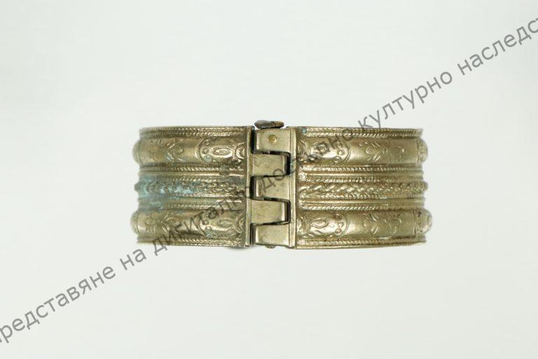 От бяла метална сплав. От две части, съединени с шарнир. Украсена с изпъкнали ивици с растителни орнаменти, между тях шнуровидни украса
