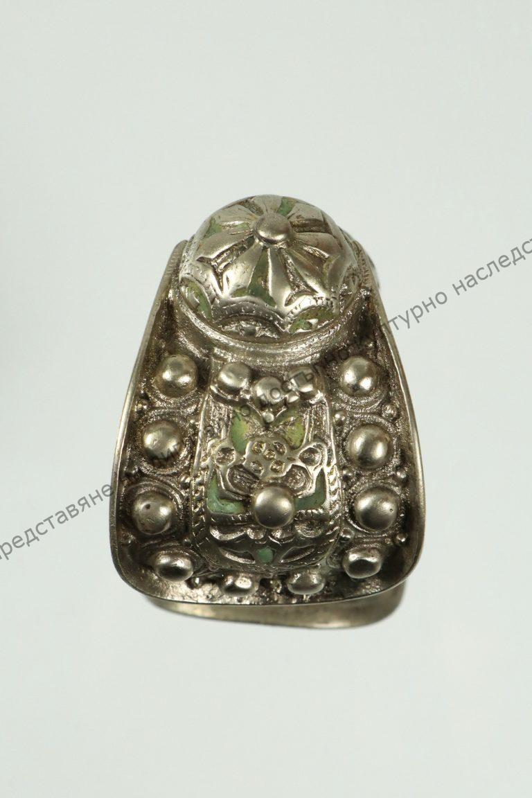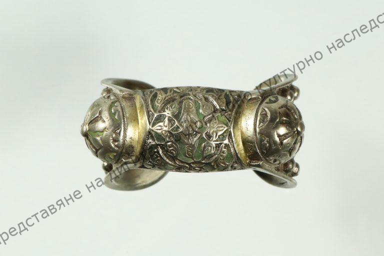 От бял метал, отворена, куха, лята. С релефна гранулирана украса, растителни мотиви, със следи от позлата и зелен емайл