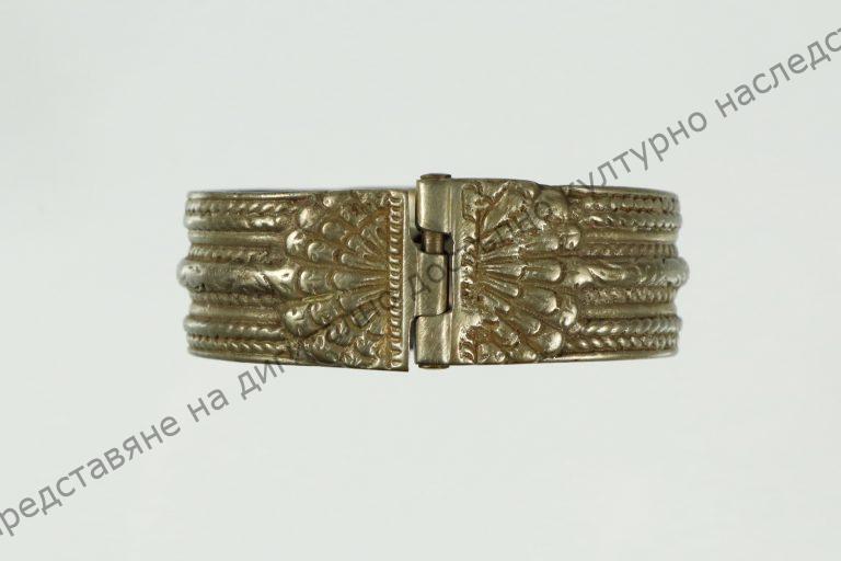 От бронз, затворена, съставена от две части свързани с шарнир. Украсена с шнуровидни ивици и една гладка. От двете страни на шарнира стилизирани цветя