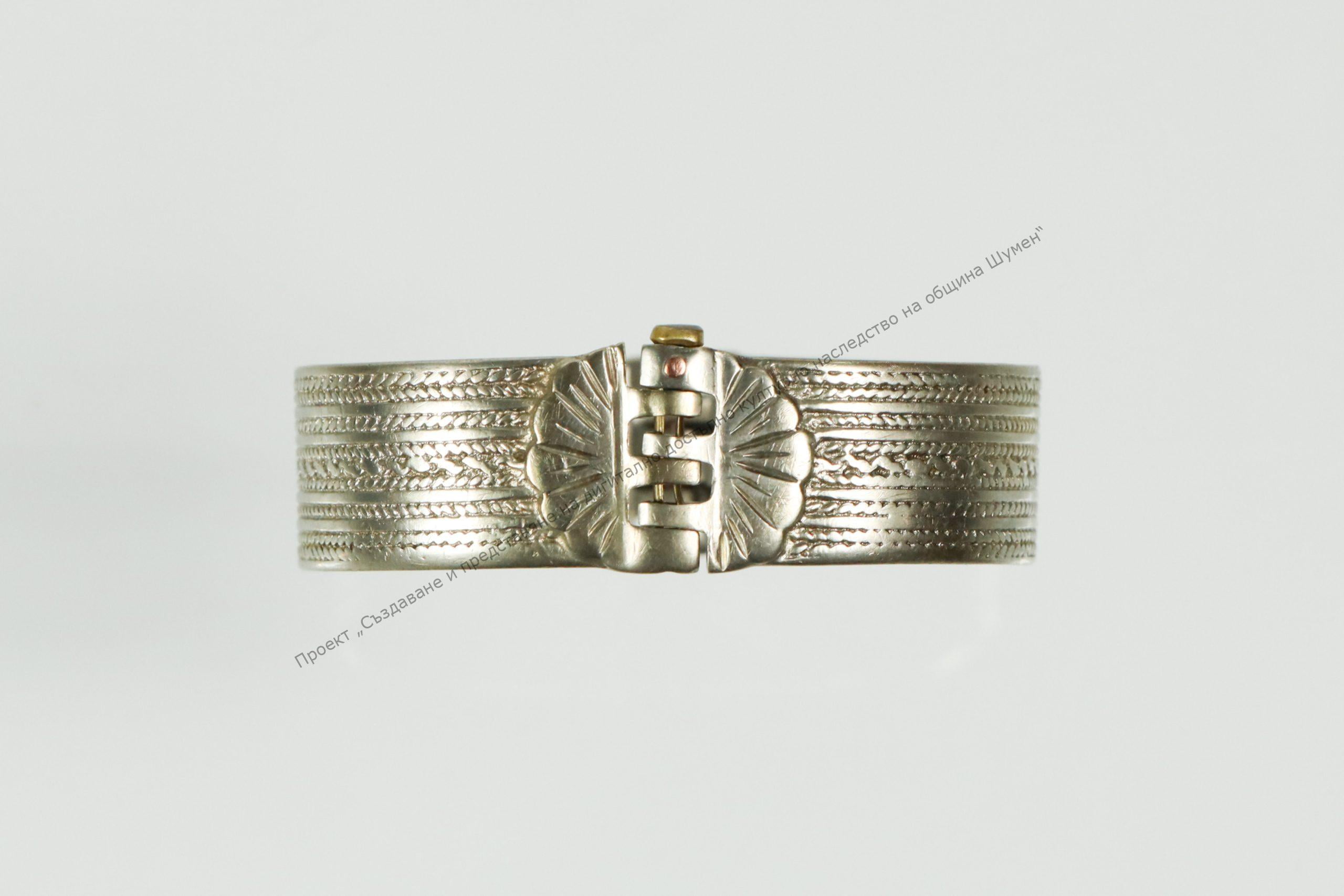 От сребро, затворена, съставена от две части свързани с шарнир. Украсена с ивици шнуровидни и гладки. От двете страни на шарнира стилизирани цветя