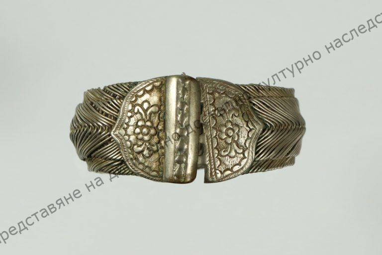 От сребърна тел, изработена с плетка „рибя кост“, в краищата плочки с украса от врязан растителен орнамент. Затваря се шарнирно