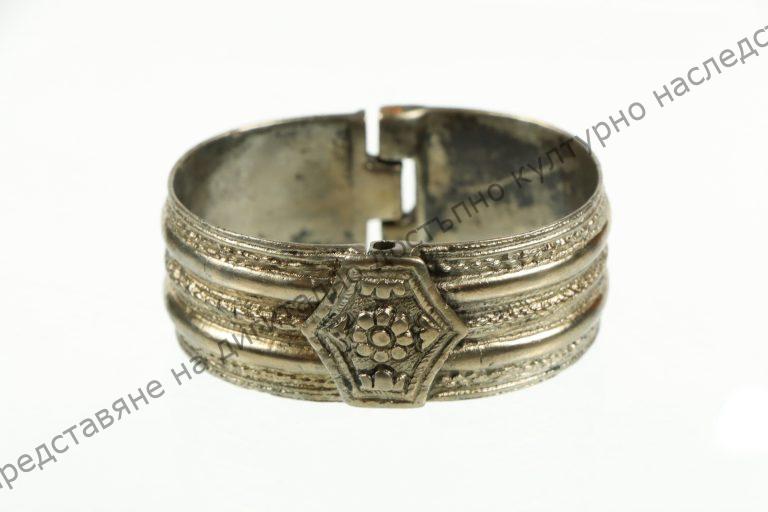 От бял бронз. Затворена, състои се от две части, затварящи се с шарнир. Украсена с гладки ивици със стилизирани цветчета, между тях изпъкнали въжевидни и шнуровидни ивици. Над мястото за закопчаване – пластинка