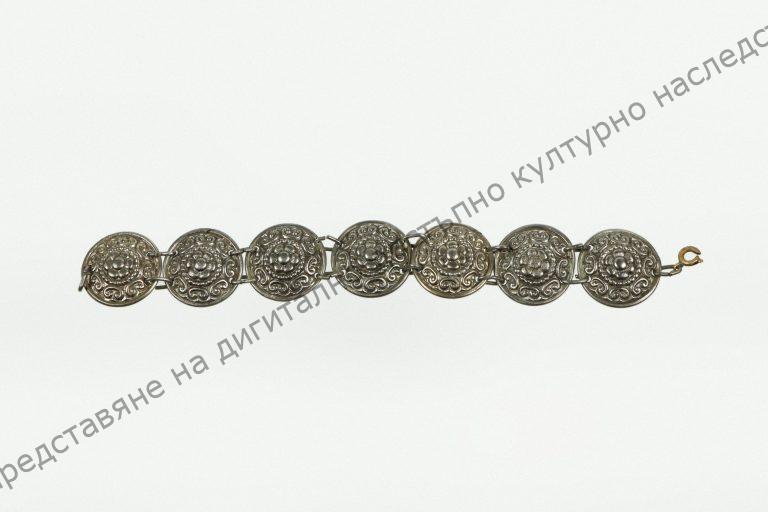 Метална, съставена от кръгли плочки с релефна растителна и гранулирана украса, съединени помежду си с халкички