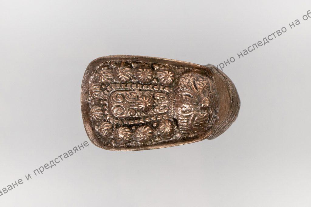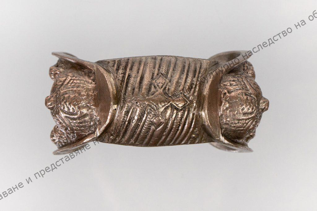 От типа отворени гривни. Изработена от сплав. Съставена от 3 лети кухи тела, споени в обща отворена елипса. Външната стена на средната част е набраздена и украсена с кръст в средата. Подковообразно разширените краища са гранулирани с 10 едри зърна. Повърхността на полусферите, които се издигат на спойките между средната част и двете крайни е покрита с четирилистна розетка.