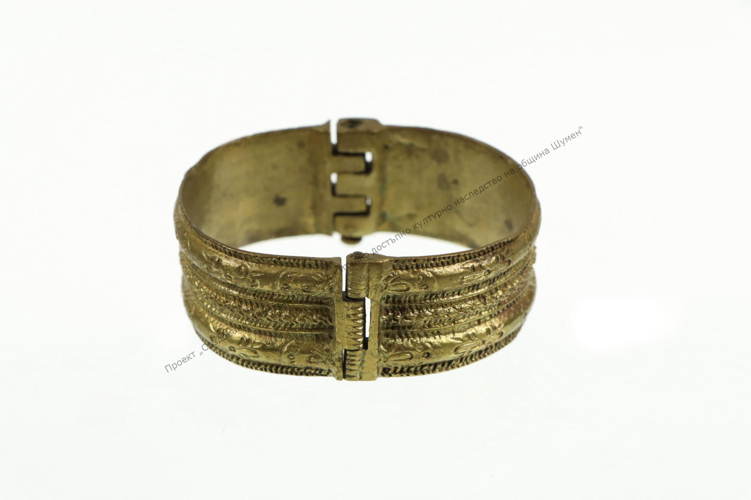 От жълт бронз. Затворена, състои се от две части, затварящи се с шарнир. Украсена с гладки със стилизирани цветченца ивици, и въжевидни ивици. Носена началото на XX век