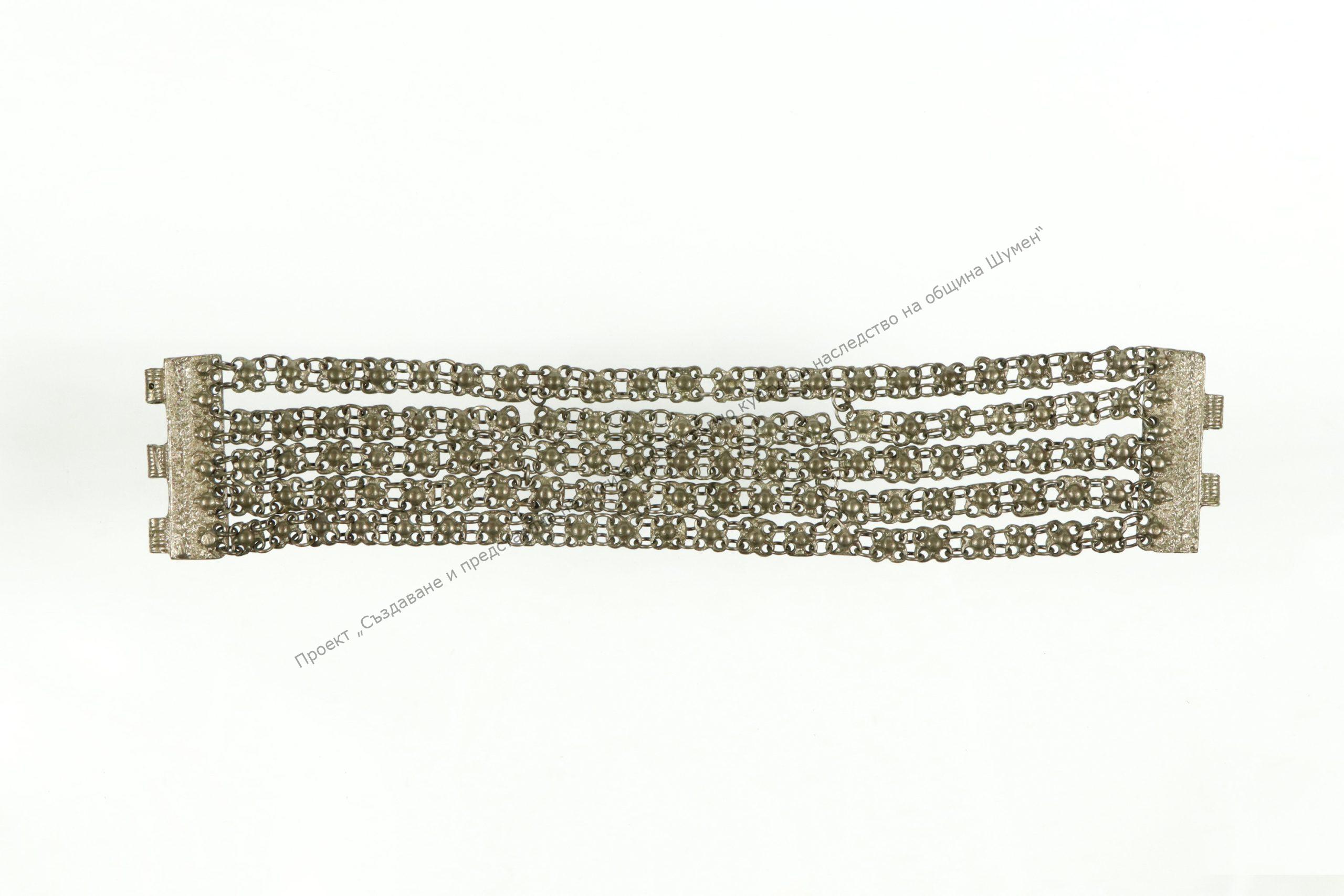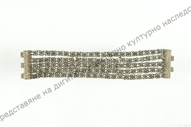 Тип „синджирлии интишии“. Състои се от верижки успоредно наредени с краища прикачени към бронзови правоъгълни пластинки, релефно украсени, затварящи се с шарнир.