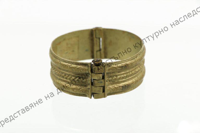 От жълт бронз. Затворена, състои се от две части, затварящи се с шарнир. Украсена с вдлъбнати и изпъкнали окръжности и врязана украса. Носена в с. Черни връх около края на XIX век