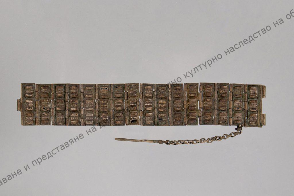 От типа ,,връхлени‘‘. Металическа. Състои се от 16 правоъгълни плочки скачени помежду си. Всяка плочка е украсена с по 3 релефни украси.