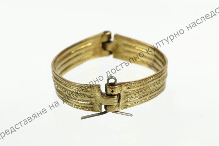 От бронз. Затворена, състои се от две части, затварящи се с шарнир. С украса от линии имитиращи филигран