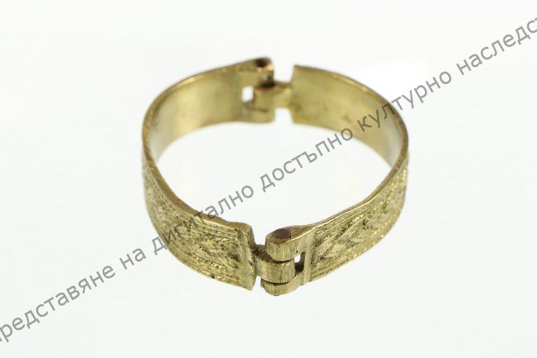 От бронз. Затворена, състои се от две части, затварящи се с шарнир. С украса от линии и плетеница имитиращи филигран