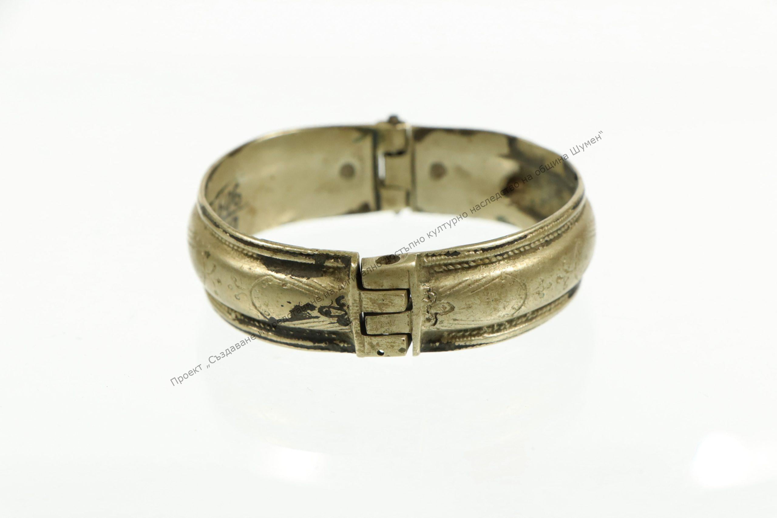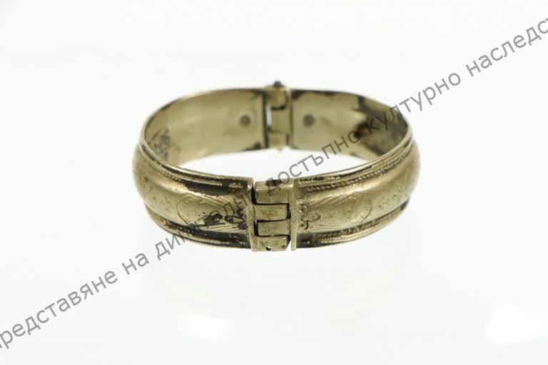 От сребро. Затворена, състои се от две части, затварящи се с шарнир. С гравирана украса в растителен стил