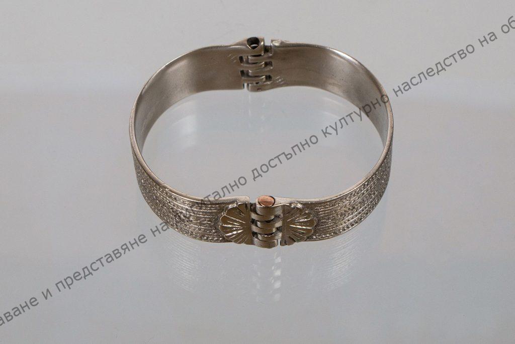 Тип ,, затворена‘‘. Състои се от две части, които се затварят с шарнир. От бронз. Украсена с успоредни шнуровидни ивици и гладки изпъкнали тънки ивици. От двете страни на шарнира стилизирано цвете.