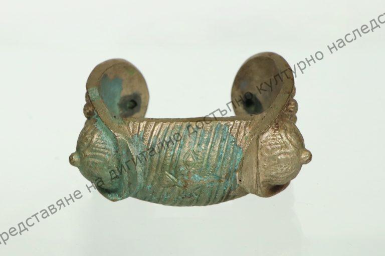 Отворена, куха, лята. Средната част набраздена и украсена с кръст, страничните с гранулирана украса и растителни мотиви