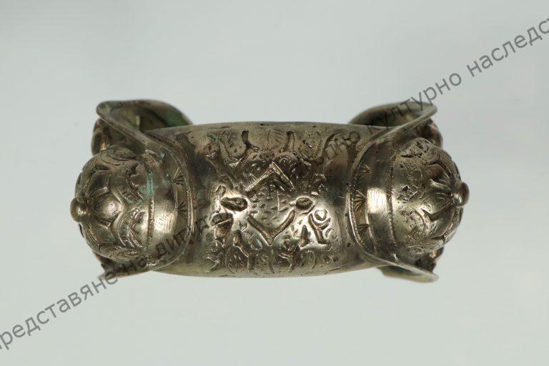Отворена, куха, лята. Средната част орнаментирана с гравирани арабески, страничните с гранулирана украса и гравирани арабески. Началото на XX век