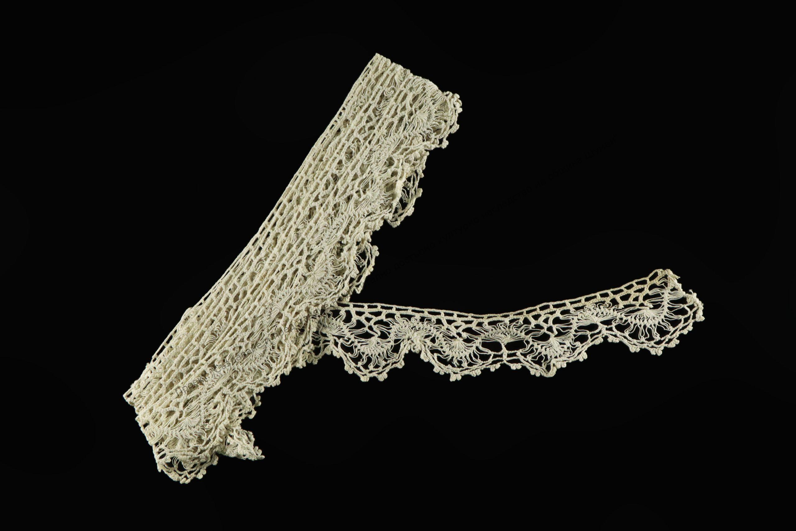 Плетена тъчно на фуркет от бели памучни фабрични конци, към 1925 г. за чеиз, за долен спален чаршаф. Употребявана до 1945-1950 г.