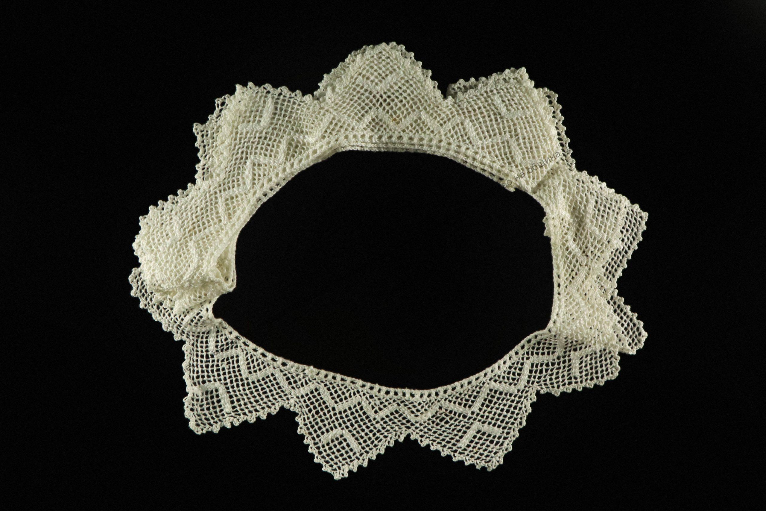 Изплетена на една кука от бели памучни конци от лелята на Дочка Петрова от с. Салманово, около 1955 г. Използвана за гарнитура на фуста