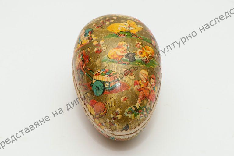 Cardboard egg, covered with pictures related to Easter. From the 40s of the 20th century