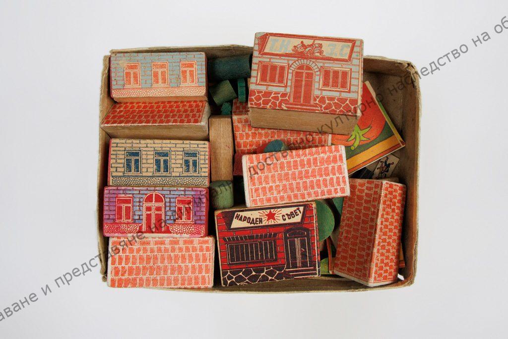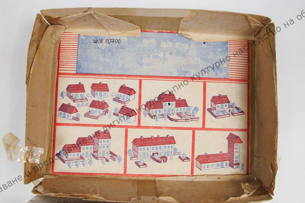 В картонена кутия са поставени дървени кубчета с различна големина и форма (предимно правоъгълни), облечени с хартия. Едно от кубчетата представя сграда на ТКЗС. Други пък са с триъгълна форма и представят покривите на сградите. Към комплекта има и борчета, огради и други дребни елементи. Датировка: 40 – те години XX в.