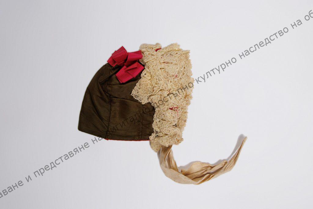От маслено зелена тафта, от 3 волана. Прикрепена за украса с 5 реда бяла фабрична дантела, отзад на нея шириш в пембяно – розово вместо панделка. Вързва се отпред с бяла панделка. Шапчицата е към годенишкият костюм. Ушивала се е от същия на костюма плат и била предназначена за първо дете. Подплатена с червен плат.