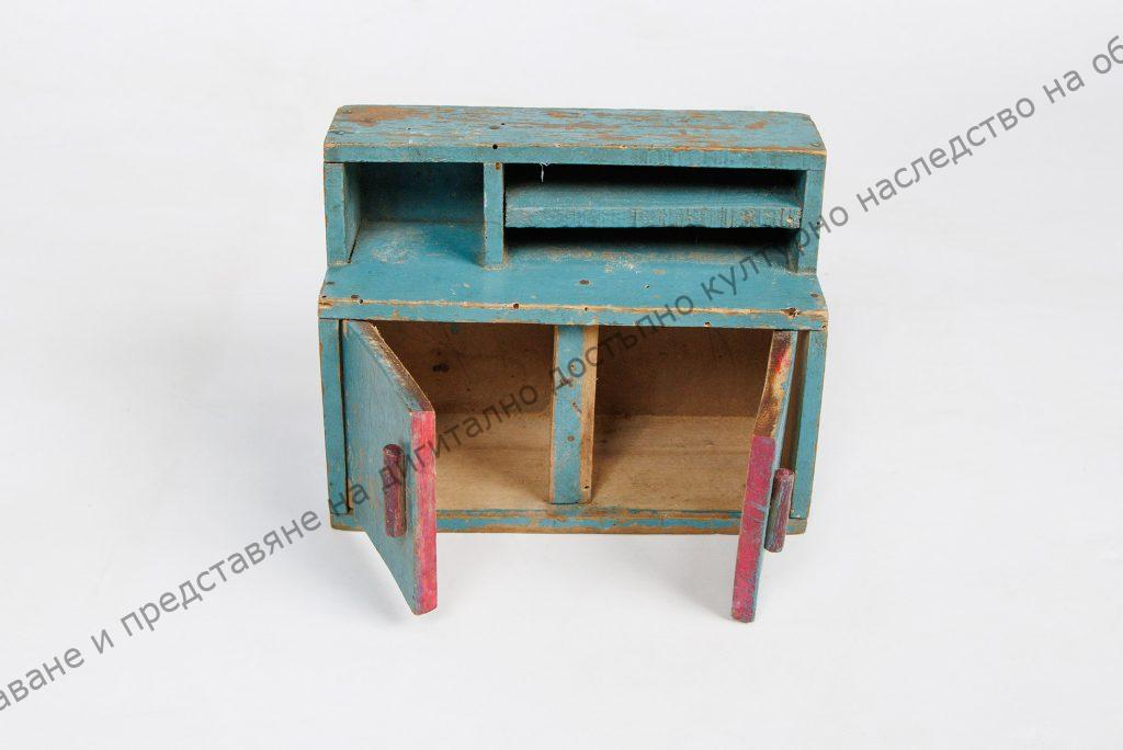 Бюфет, маса, столче. Бюфетът е в син цвят с два шкафа в долната си издадена част. Те се отварят с две дървени червени дръжки. Бюфетът е с две етажерки в горната част. Масата е с кръгъл плот и с квадратна поставка, също в син цвят. Столчето е с четири крачета в червен цвят и седалка с квадратна форма в син цвят. От 50-те години на XX в.