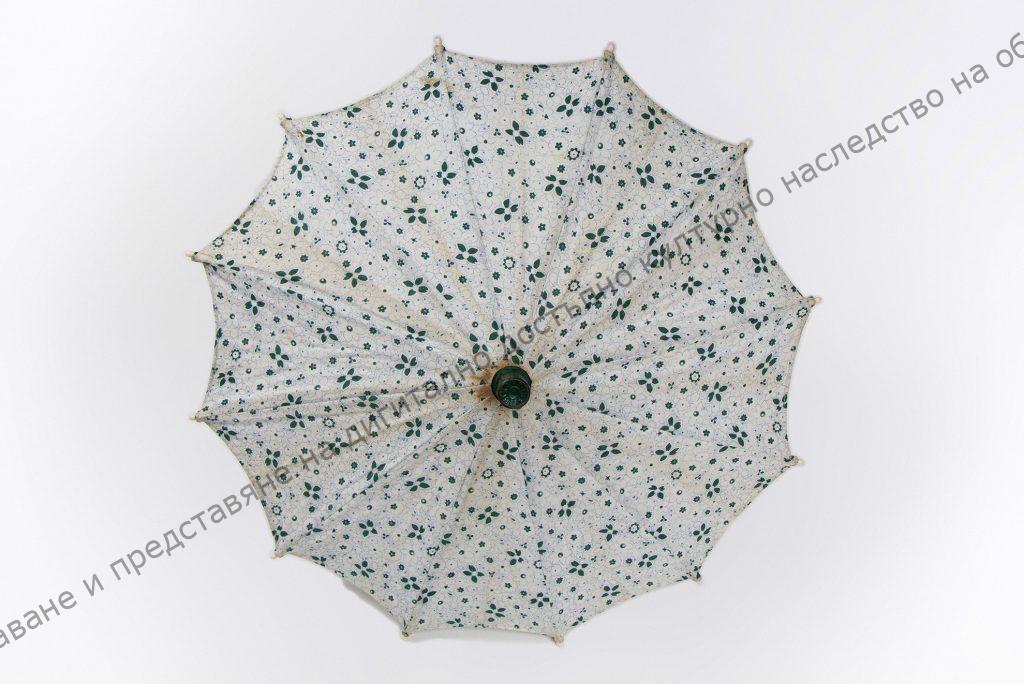 С дървена дръжка, стругована и боядисана в зелено, с шнур от преплетени върви в кафеникаво и сиво. Към металната част на чадърчето е прикрепен памучен бял плат на зелени цветчета. На върха има зелено тенекиено капаче с надпис „ПЕТКАНОВЪ“