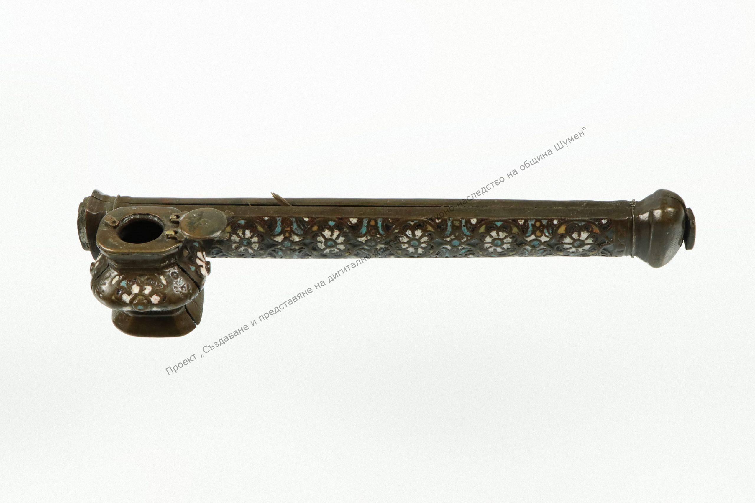 Of bronze, tubular shape. Decorated with floral ornaments in yellow, green, blue and white enamel