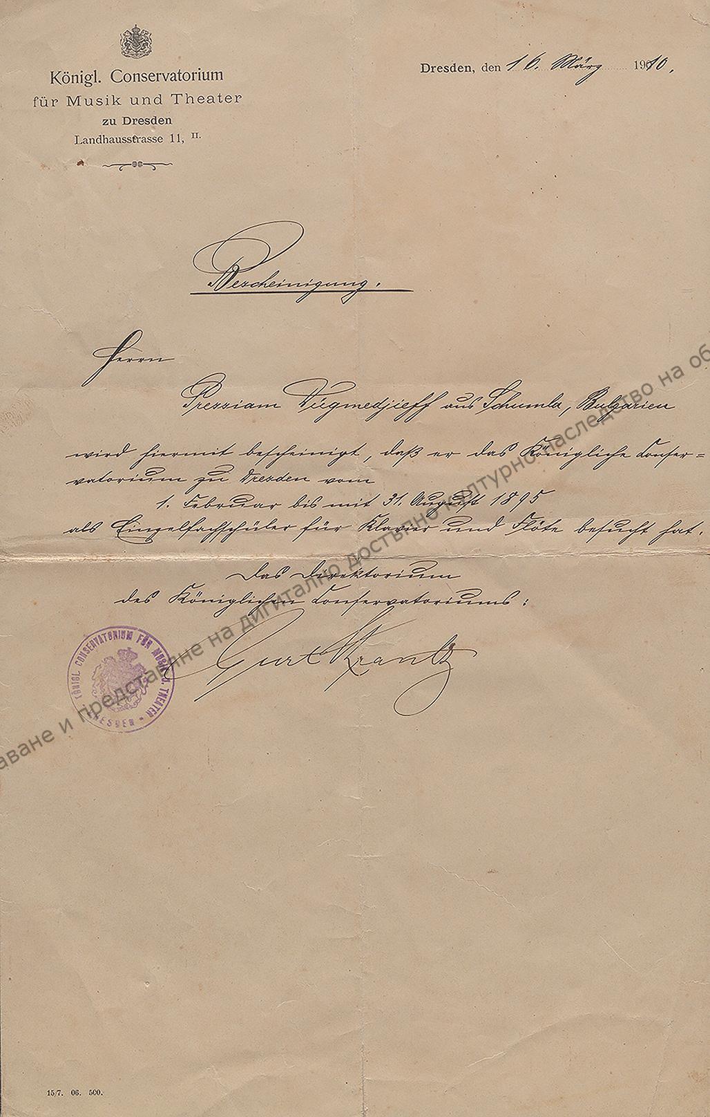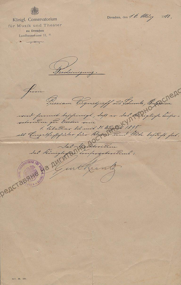 Document sent by the Royal Conservatory of Music and Theatre in Dresden to K. Dyukmedzhiev acknowledging that he graduated piano in 1895, 16th of March 1910