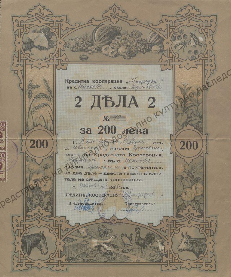Share № 40 – 2 shares for 200 leva of Kolyu Ivanov Dobrev from the village of Ivanovo – member of “Napredak” Credit Cooperative, 10th of January 1946