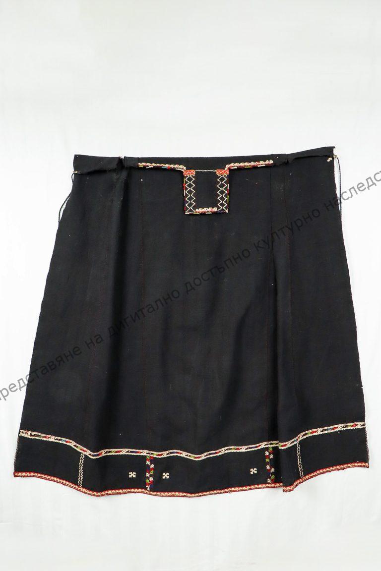 От вълна. Домашно тъкана. По средата отгоре пришито орнаментирано парче „мантичка“. Шита с памучни и вълнени цветни конци, заобиколени кръстчета и бод чертички