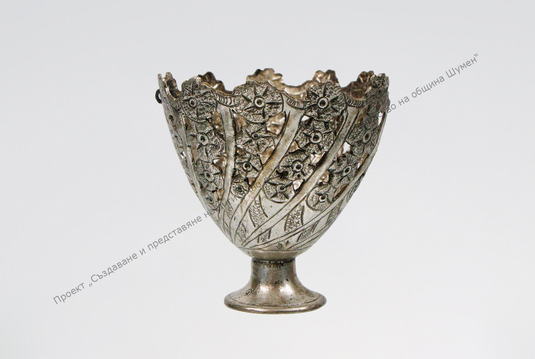 От сребро, кован. Ажурна изработка. Поставката – равна, лята