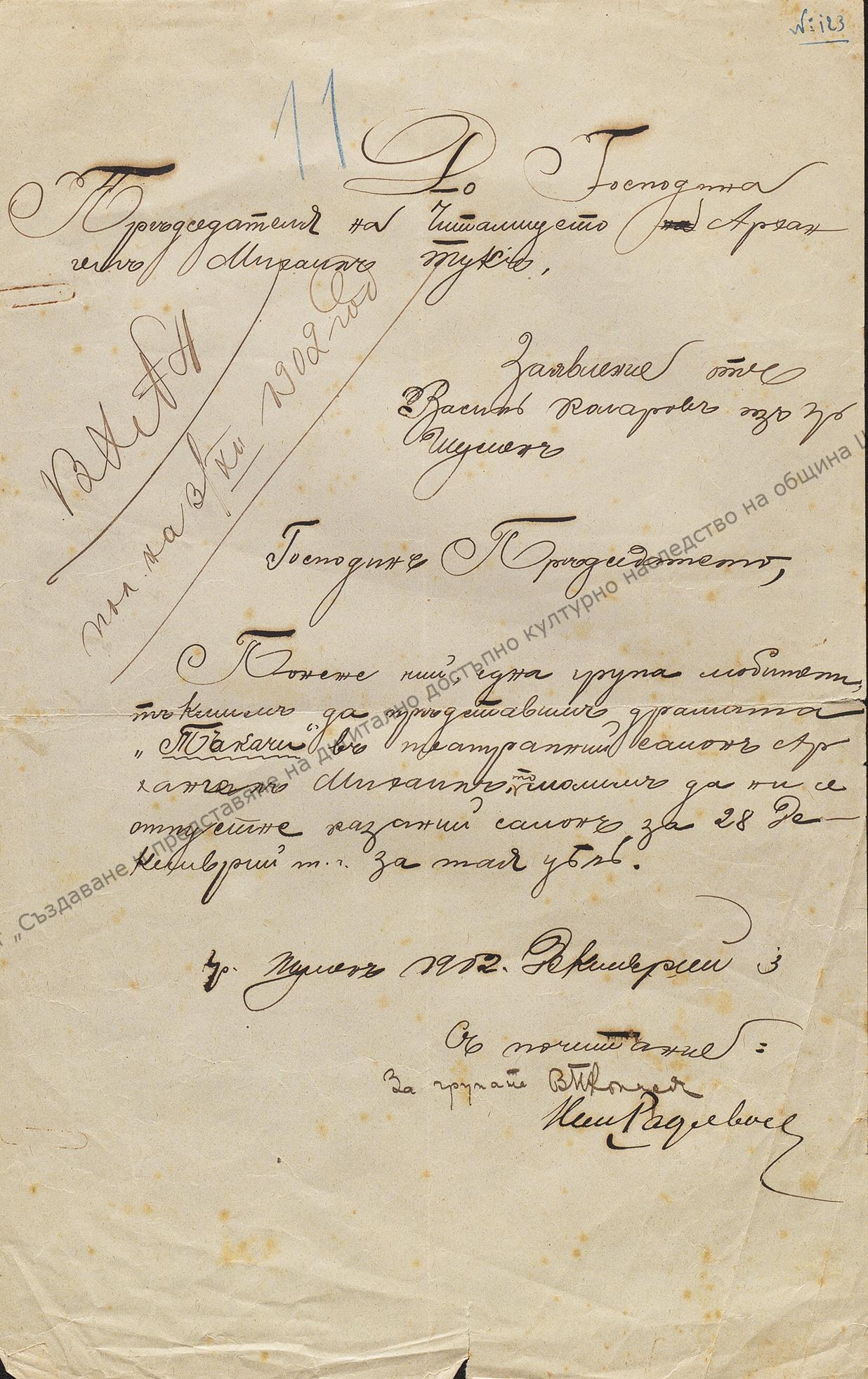 Заявление от В. Коларов до председателя на читалище „Архангел Михаил“. 3. XII. 1902 г.