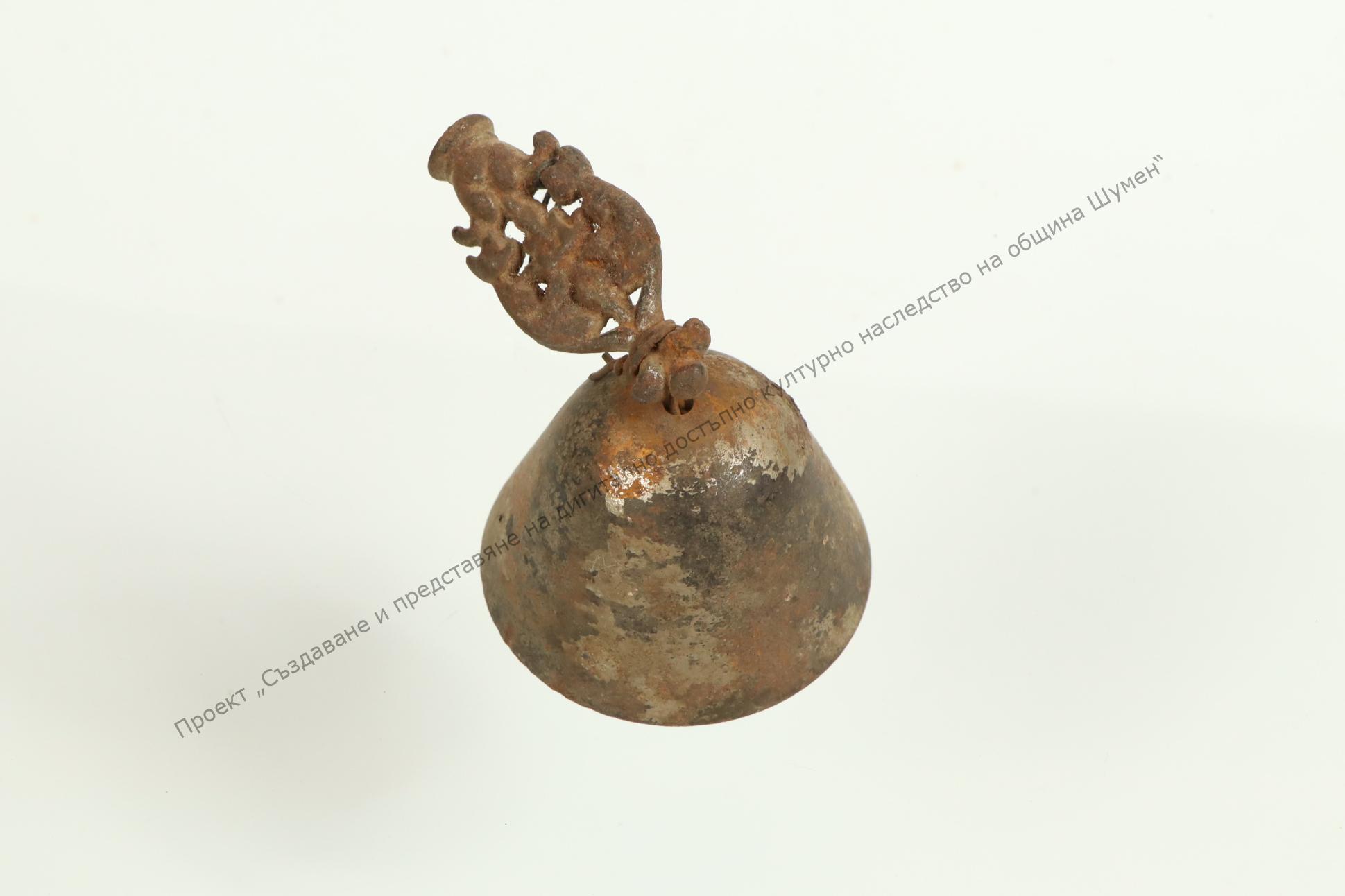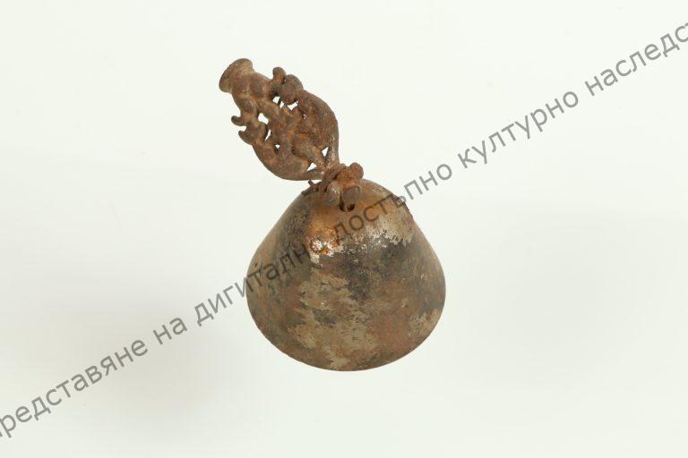 Of bronze, cast, cone-shaped, no decoration on the body, openwork handle