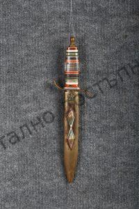 Double-edged blade, with a wide fuller on each side. The hilt is composite, made of lamellae of artificial material of different colours. The guard and the pommel are of bronze. The scabbard is also of bronze lamellae, soldered on the reverse. It belonged to Major General Bocharov – member of the Military Council of the 57th Soviet Army.