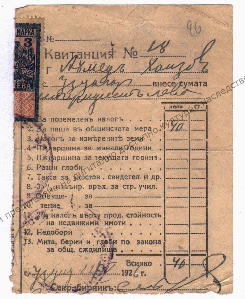 За поземлен налог от 40 лв. на Ахмед Хаизов за 1926 г. с гербова марка от 3 лв.