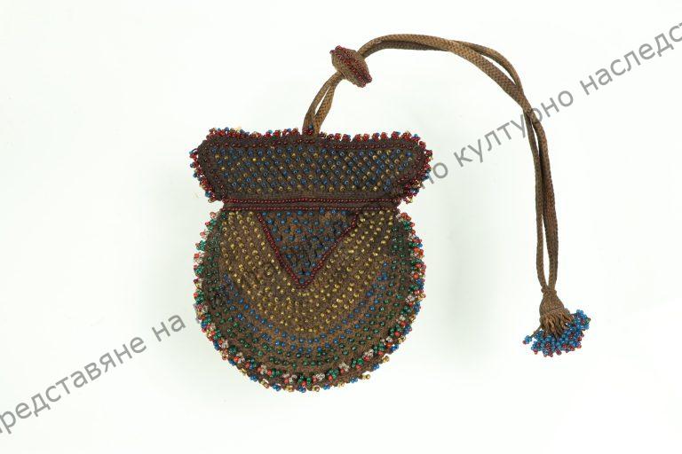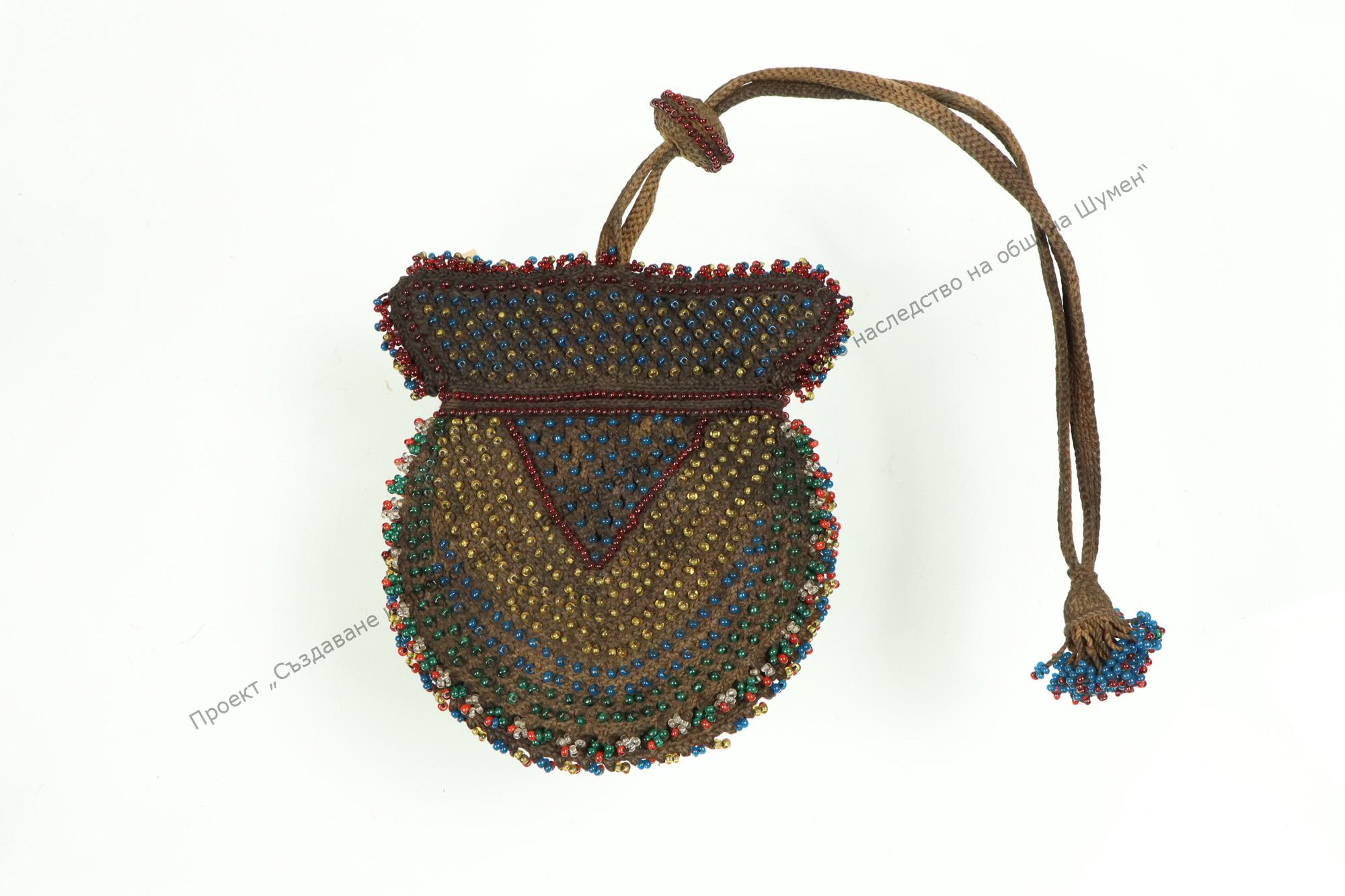 Coin purse. Hand knitted and trimmed with multicoloured beads