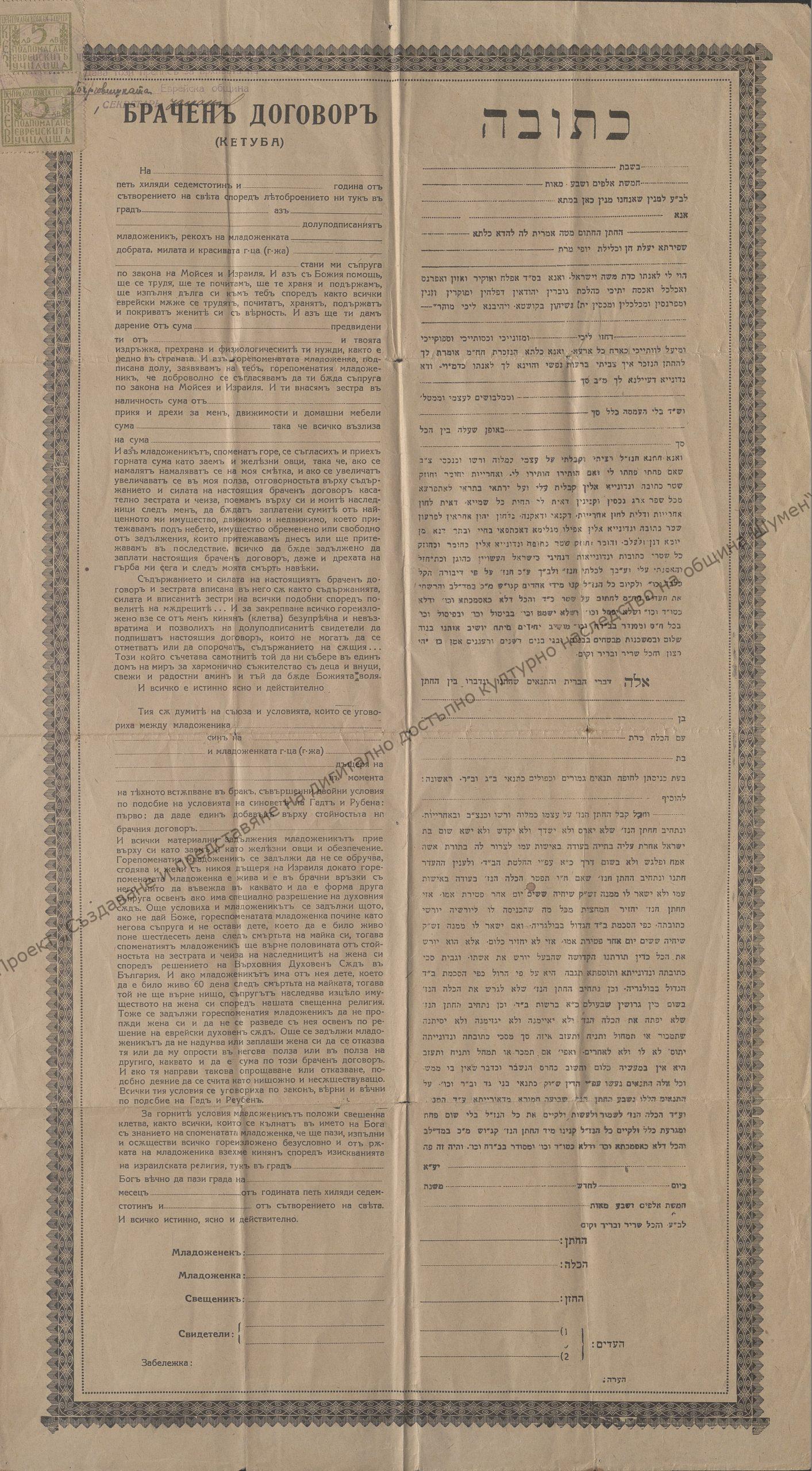 Marriage contract – specimen from 1945 written in Hebrew (right) and in Bulgarian (left)