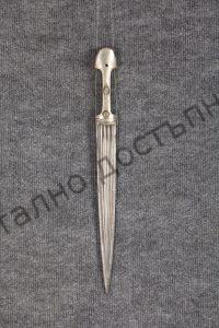 Eastern type. Steel blade with three channels on both sides. The grip is covered with bright metal, probably with wooden core. The scabbard is of wood, covered entirely with the same metal as the grip. The decoration is of incised eastern motifs.