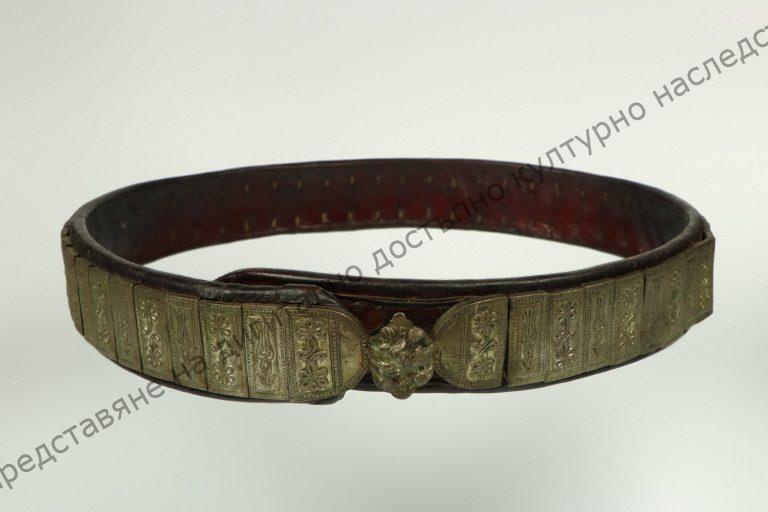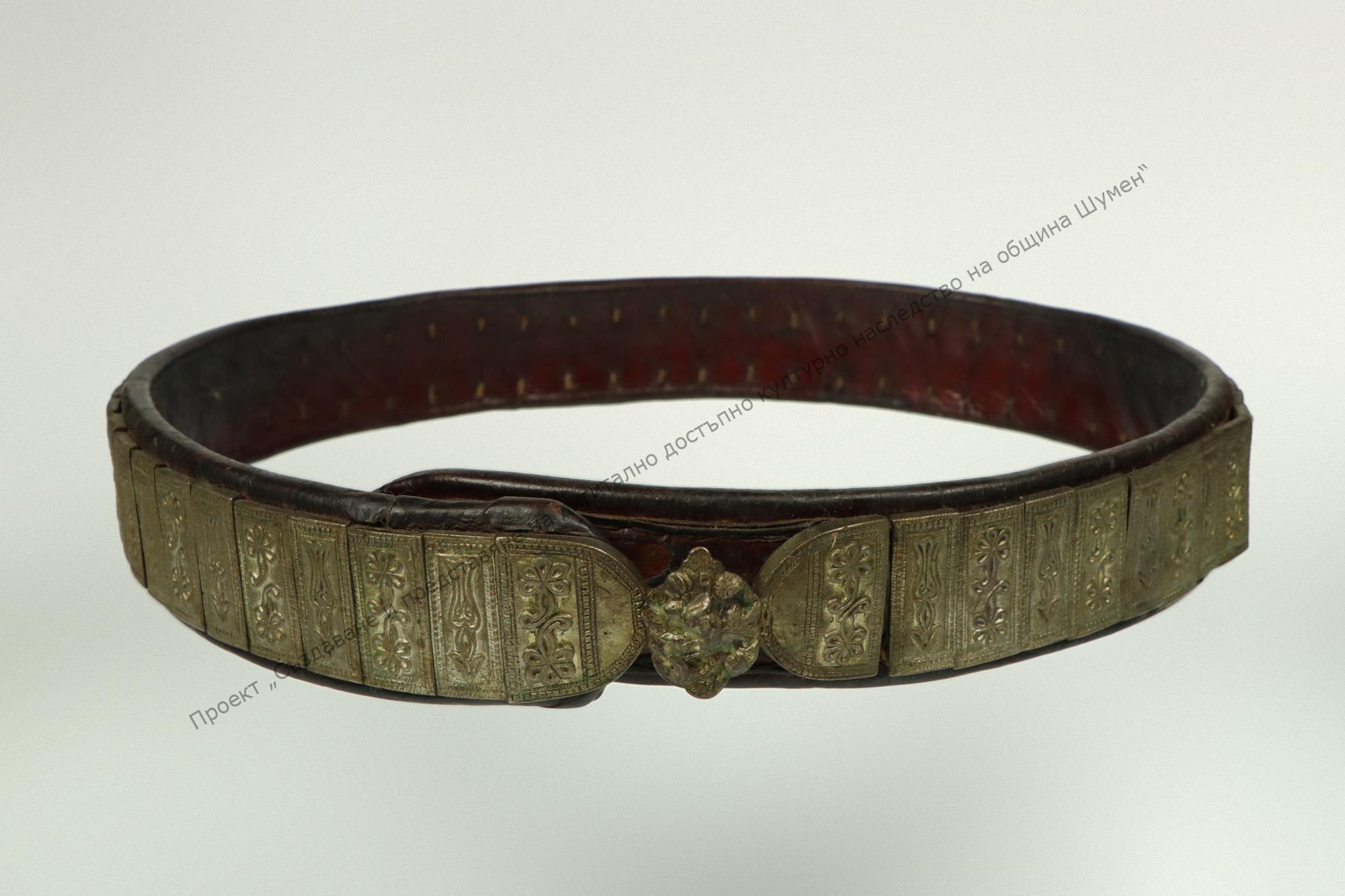 Set of cast plates, copper, bronzed, with stylized floral and geometric decoration. Semispherical buckles with same decoration