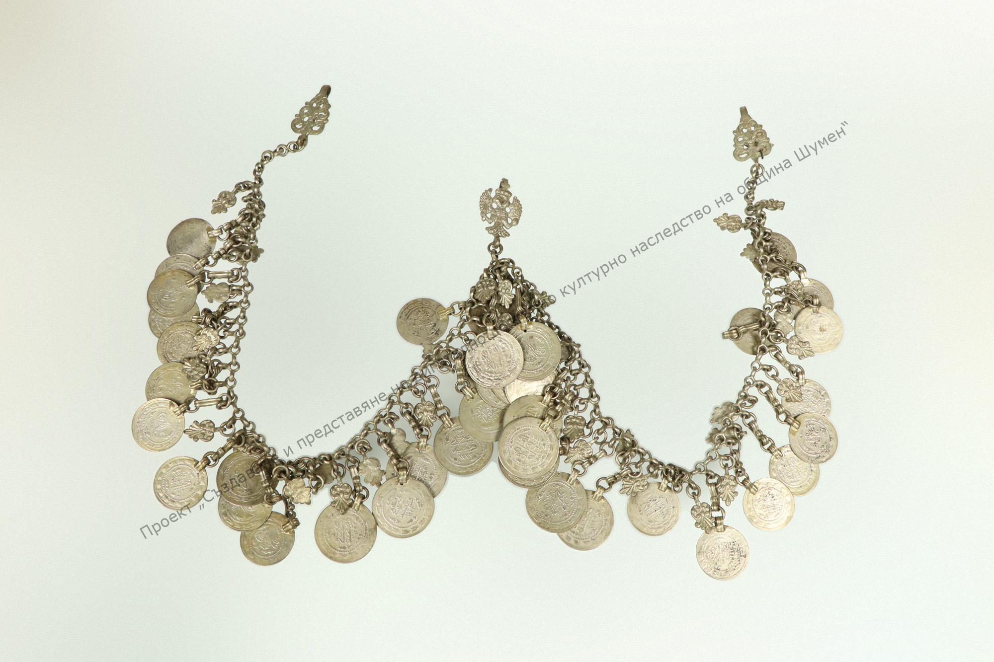 Metallic, from Debarsko. Silver Turkish coins and leaf pendants attached to the chain. Fastened to the garment by means of three plates ending with a hook