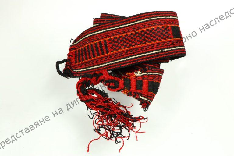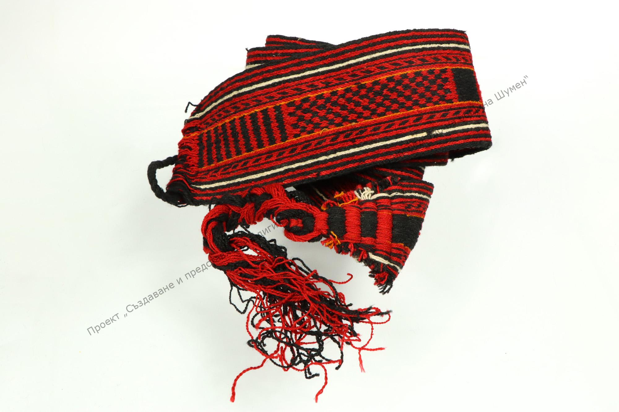 Тъкан на кори с цветна вълнена прежда, редуване на геометрични фигури. Носен около 20-30-те години на XX век в Горна Златица, Поповско