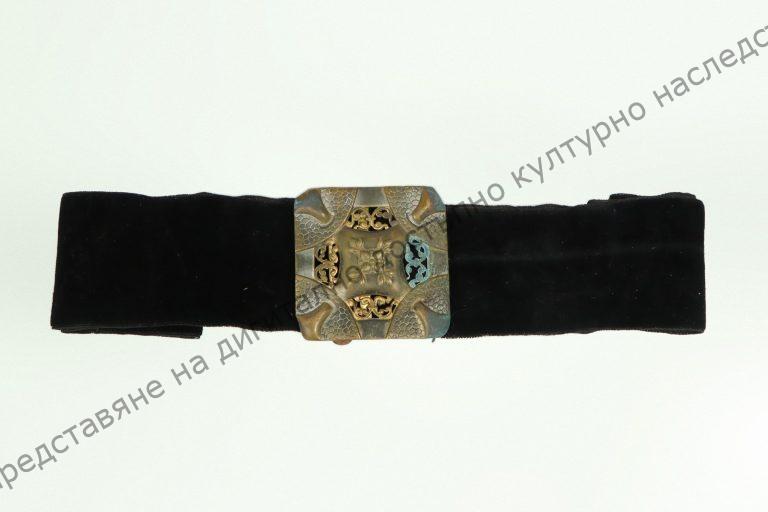 Изработен от тъмно синьо кадифе. Закопчава се с метална тока, релефно украсена с растителни орнаменти и ажури. Принадлежал на д-р Данчева, лекар от Шумен