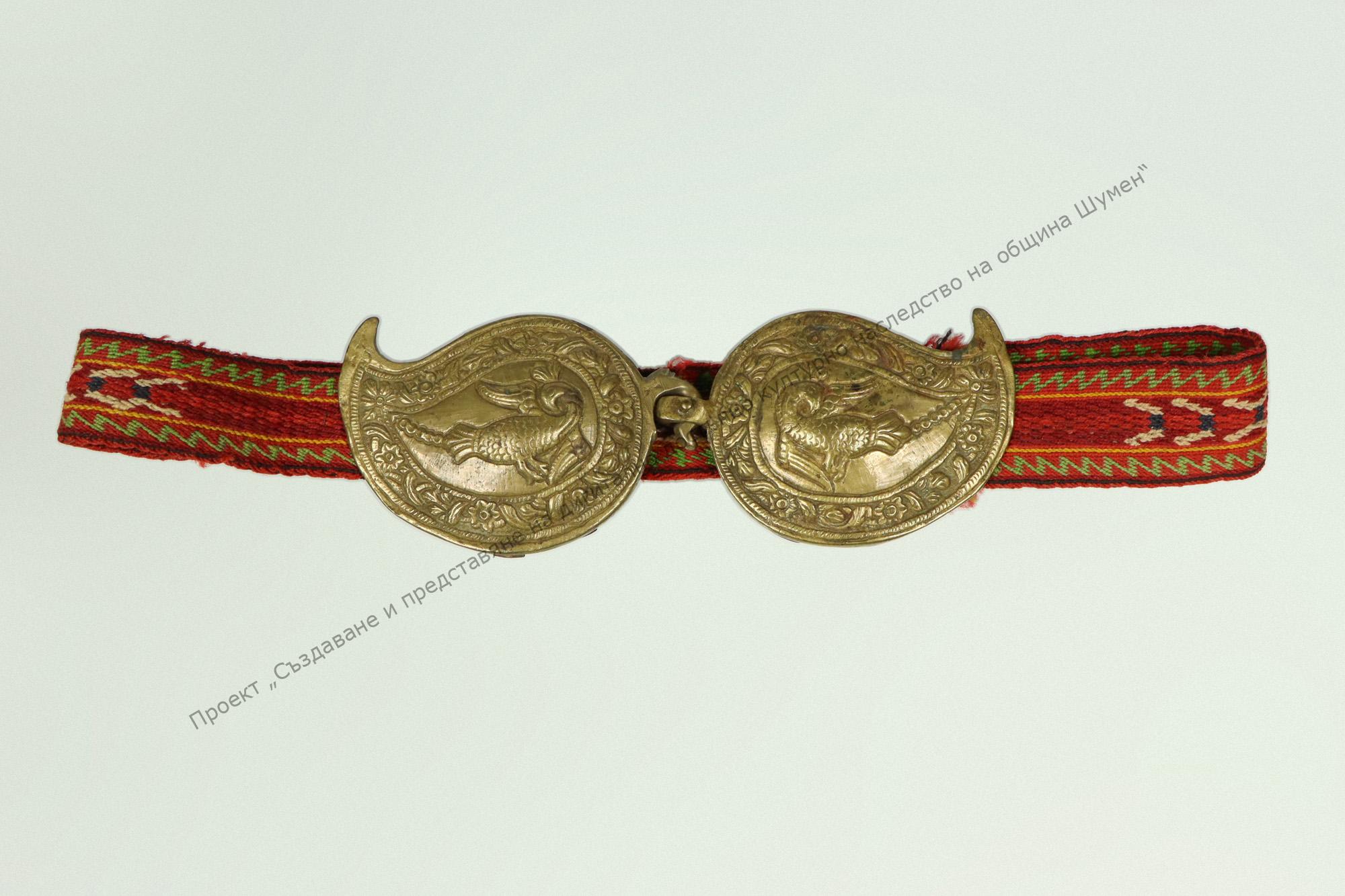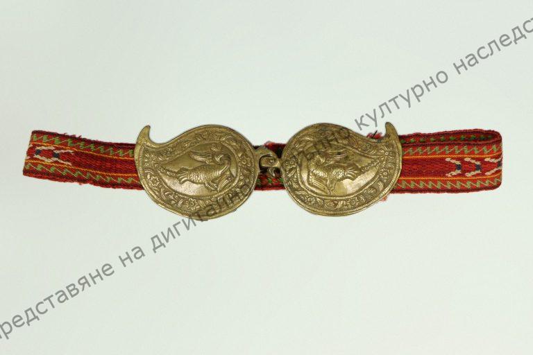 Тъкан на кори, с геометрични форми. Завършва с пафти от жълт метал с релефна украса от геометрични орнаменти и птица. От 20-те години на XX век