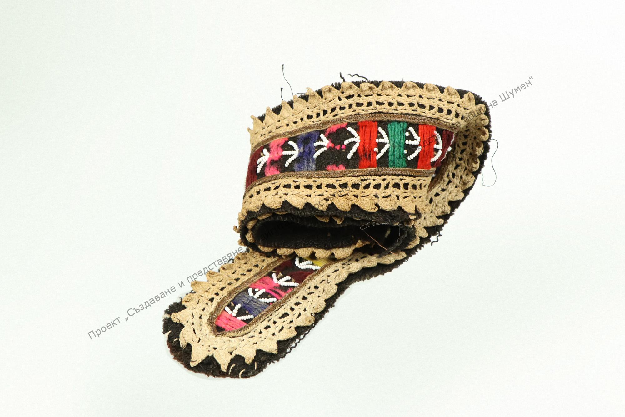 Коланът е монтиран върху вълнен плат. По дължина в двата края е изплетена ажурна дантела, между нея украса от цветни вълнени конци и фигури от синци. Изработен през втората половина на XIX век