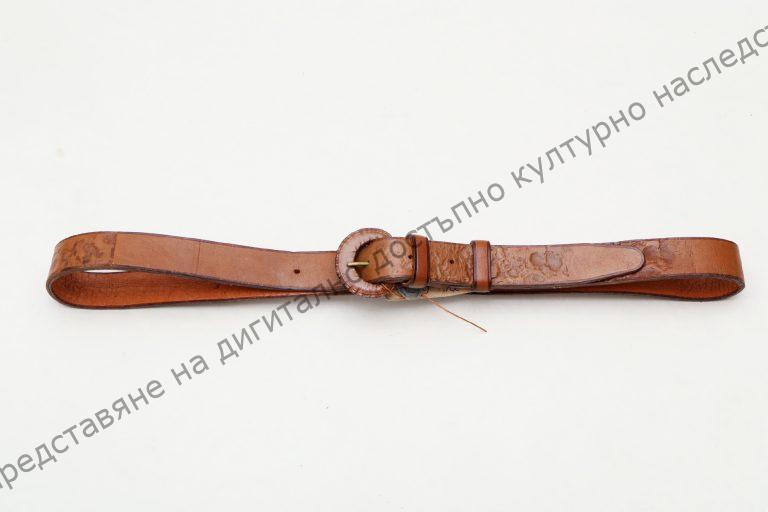 Мъжки. От кожа, двоен, с ръчно гравирана украса на места. Изработен от Милко Минчев – майстор на художествените занаяти