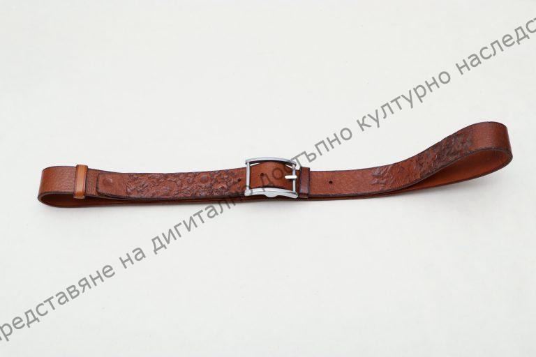 Мъжки. От кожа, с ръчно гравирана украса на места. Изработен от Милко Минчев – майстор на художествените занаяти