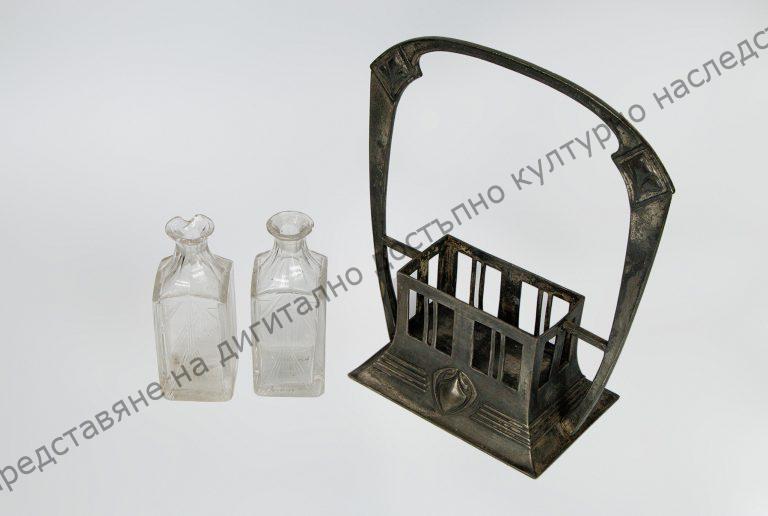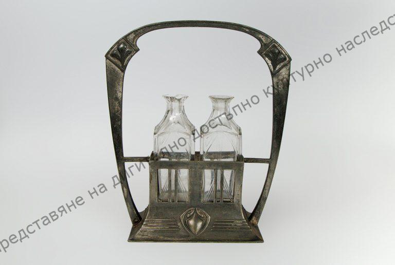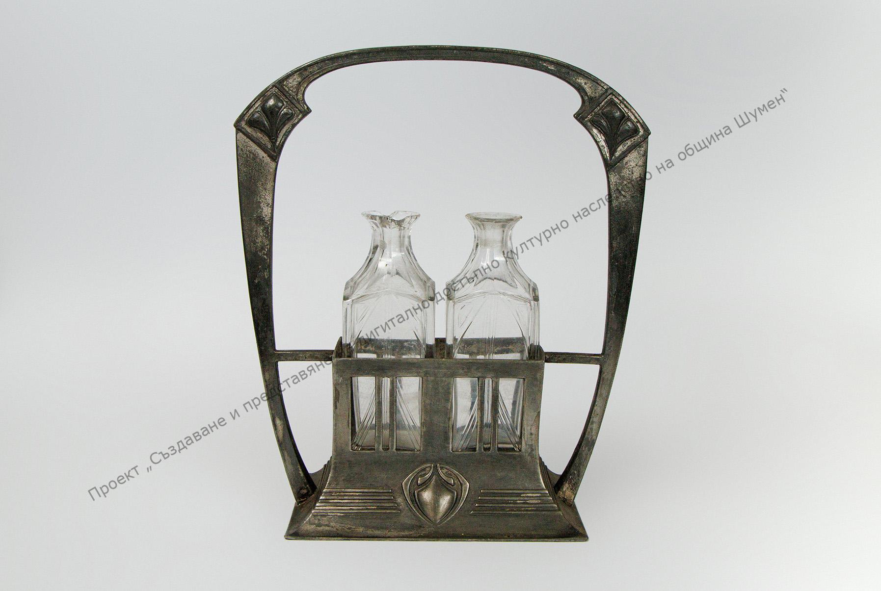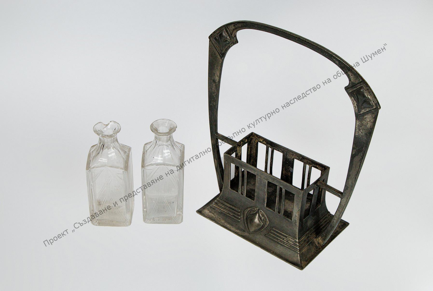 Метална поставка с две гнезда за шишета. Те са изработени от прозрачно стъкло с форма на призма. Врязана украса