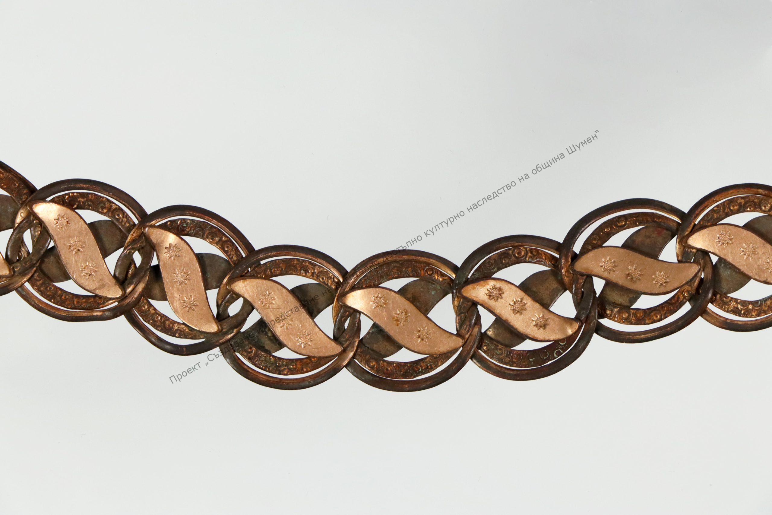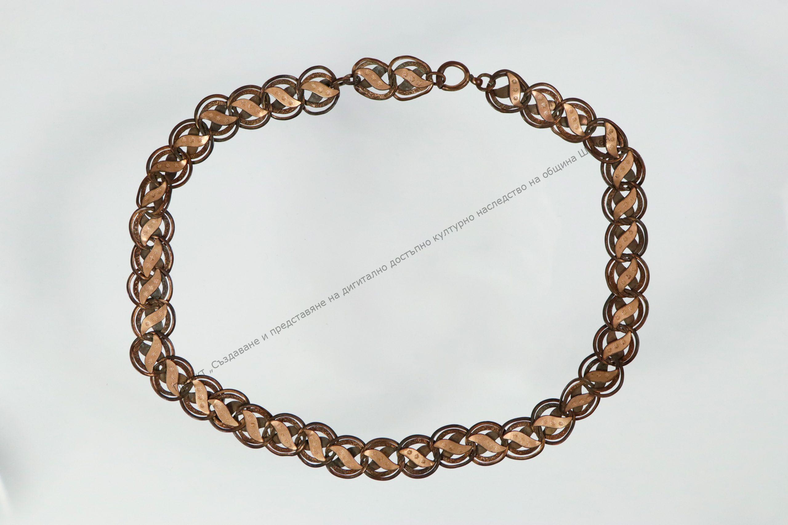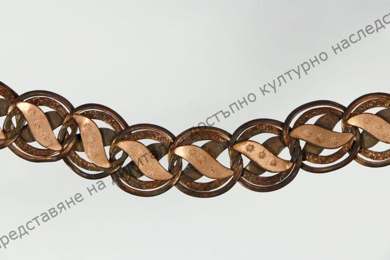 От метална сплав. Ажурно изрязани плочки с листовидна форма, припоени върху кръгли халкички, Халкичките захванати една за друга и образуват гердана