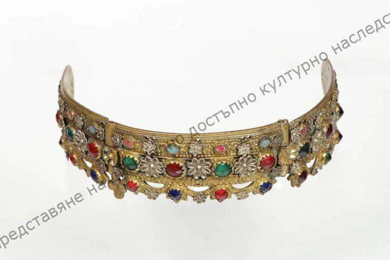 От бронз. Тревненски тип сокай. Състои се от три части, свързани с шарнир. Украса от камъчета, композиция от лети цветчета, гранулирана повърхност, ажурен ръб